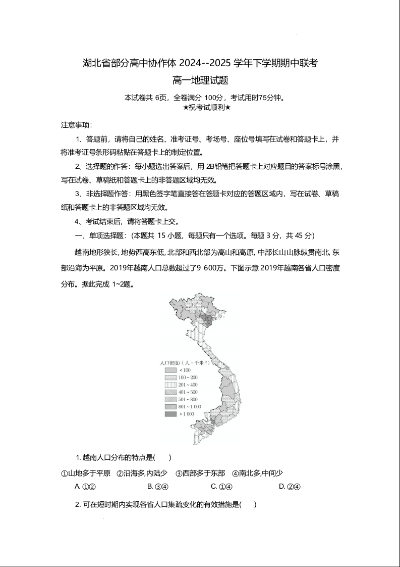 湖北省部分高中协作体2024-2025学年下学期4月高一期中联考地理+答案