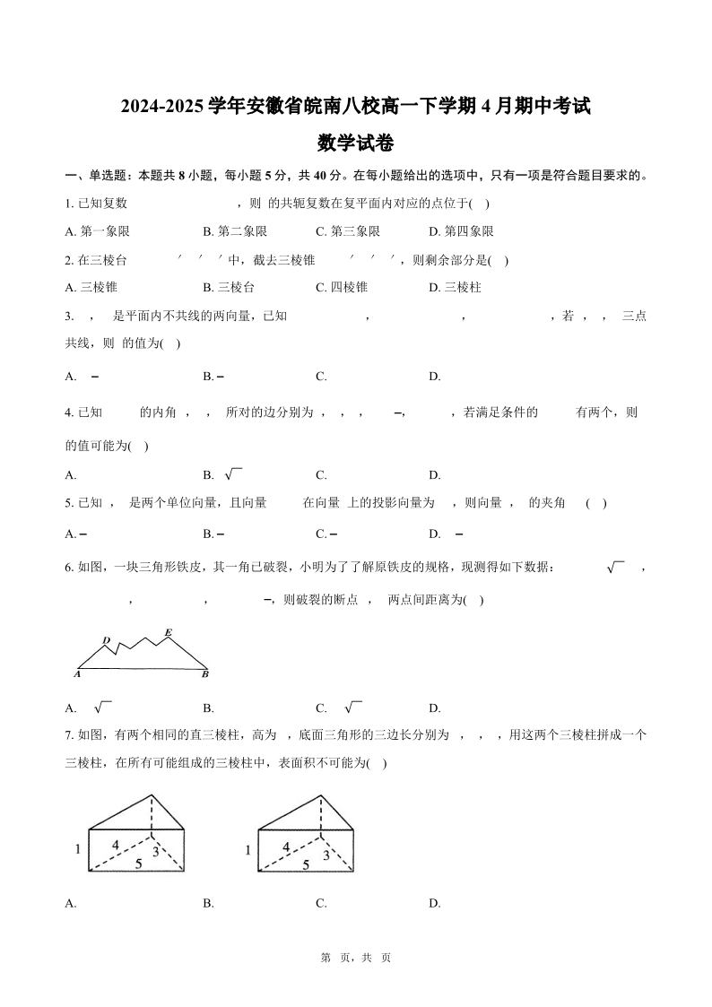 安徽皖南八校”2024-2025学年第二学期高一期中考试数学+答案