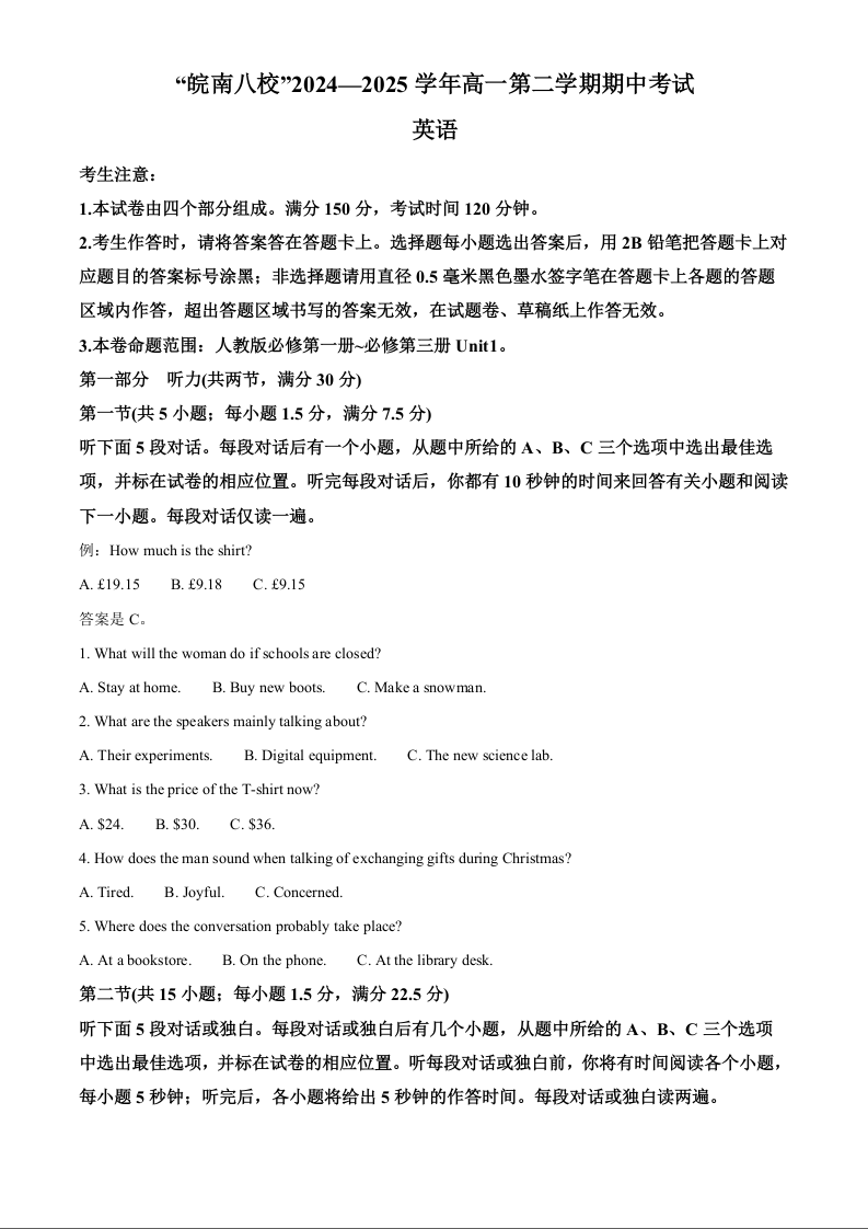 安徽皖南八校”2024-2025学年第二学期高一期中考试英语+答案
