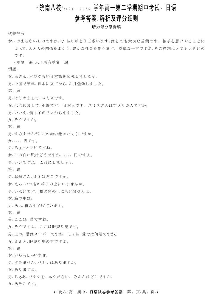 安徽皖南八校”2024-2025学年第二学期高一期中考试日语答案
