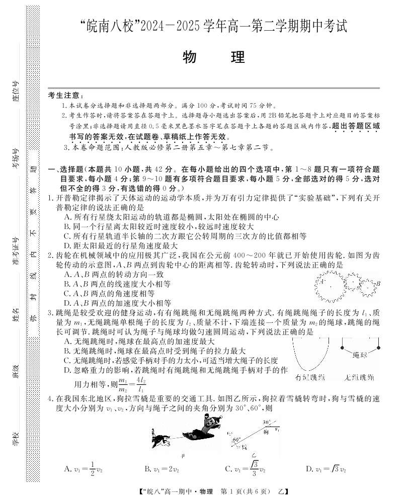 安徽皖南八校”2024-2025学年第二学期高一期中考试物理(乙)
