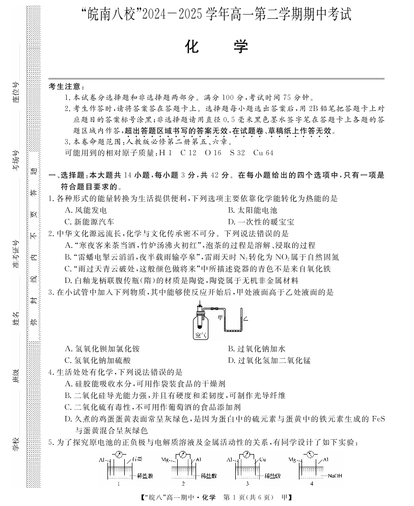 安徽皖南八校”2024-2025学年第二学期高一期中考试化学(甲)