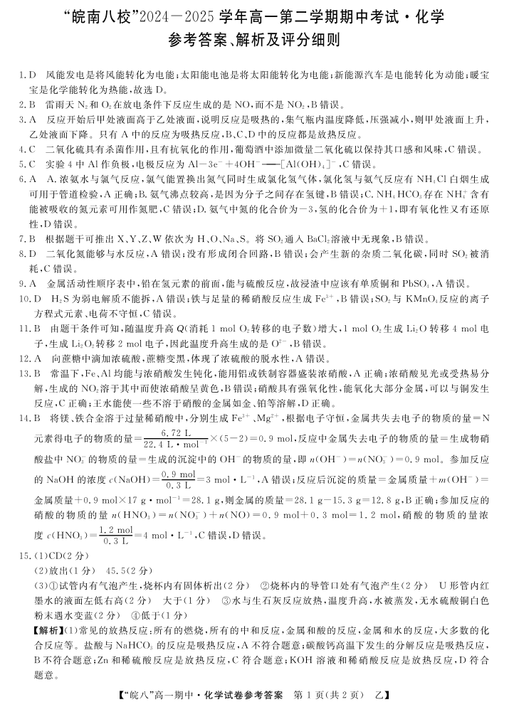 安徽皖南八校”2024-2025学年第二学期高一期中考试化学(乙)答案
