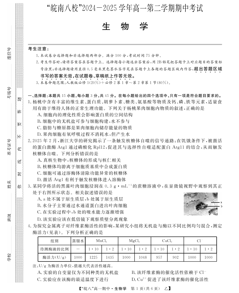 安徽皖南八校”2024-2025学年第二学期高一期中考试生物(乙)