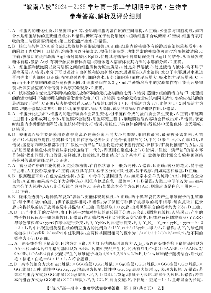安徽皖南八校”2024-2025学年第二学期高一期中考试生物(乙)答案