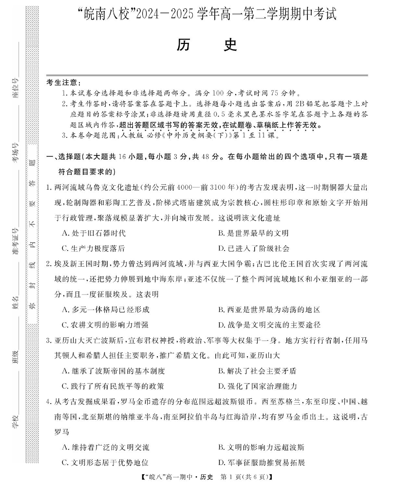 安徽皖南八校”2024-2025学年第二学期高一期中考试历史+答案