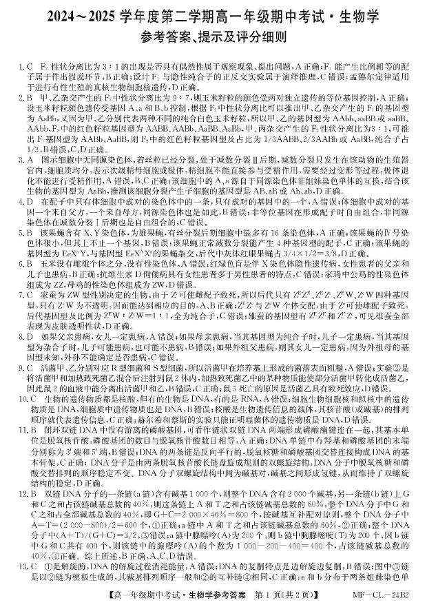 河北省沧州市四县2024-2025学年下学期4月高一期中考试生物答案