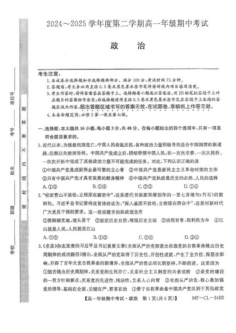 河北省沧州市四县2024-2025学年下学期4月高一期中考试政治+答案