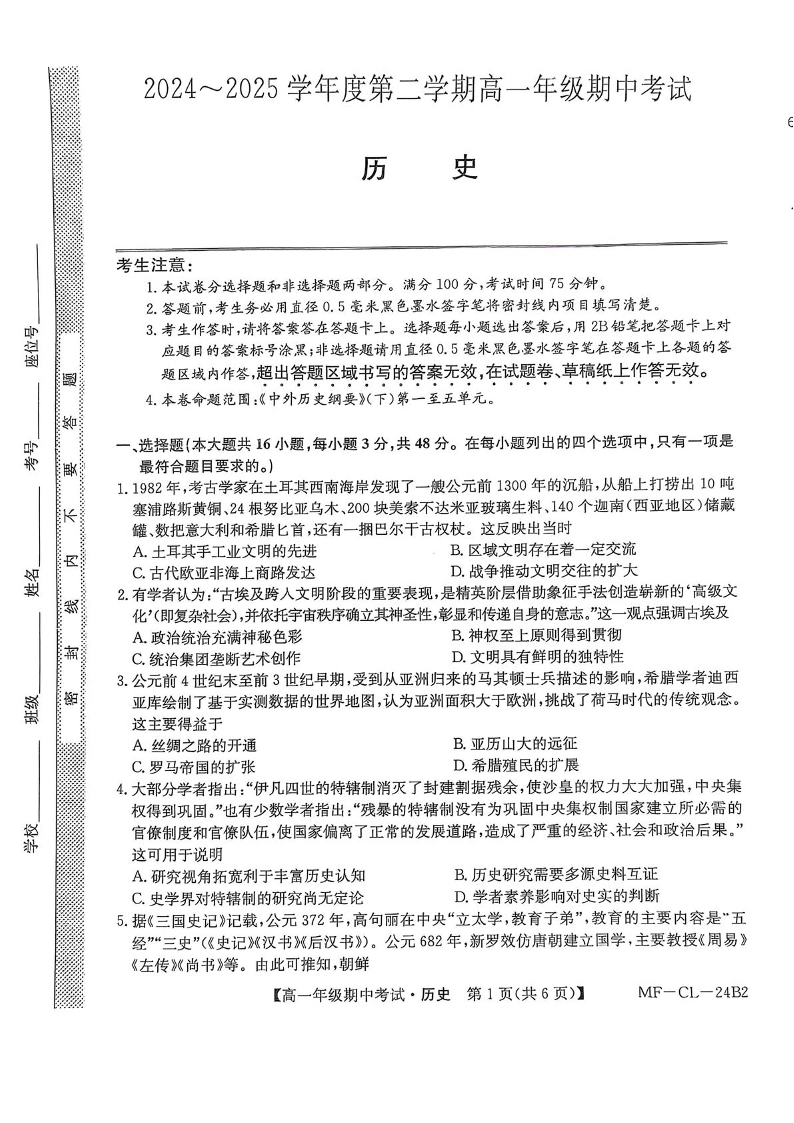 河北省沧州市四县2024-2025学年下学期4月高一期中考试历史+答案