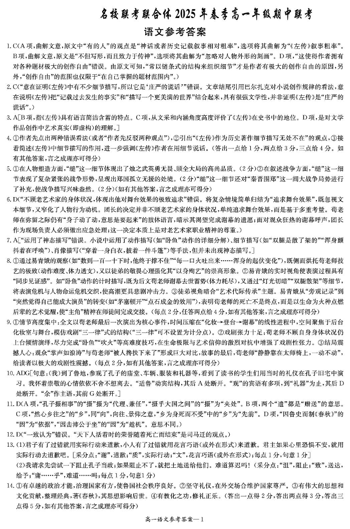 湖南省名校联考联合体2024-2025学年下学期高一期中考试语文答案