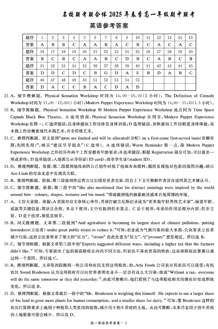 湖南省名校联考联合体2024-2025学年下学期高一期中考试英语答案