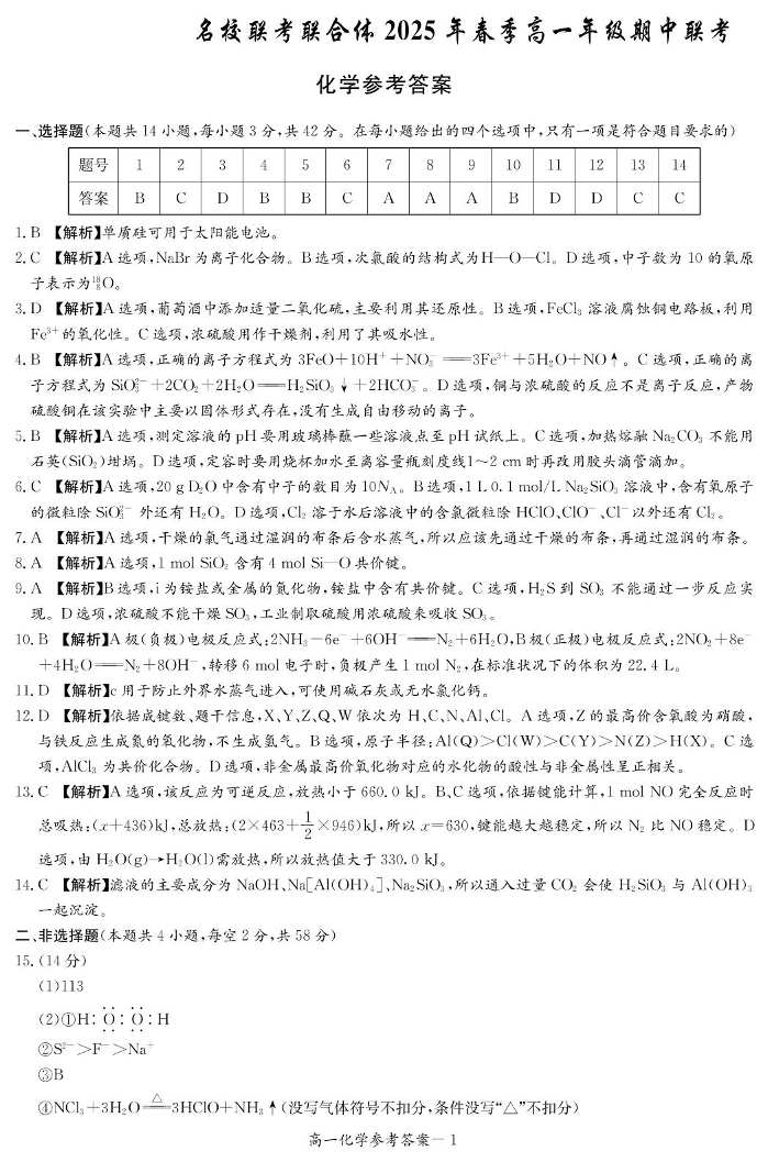 湖南省名校联考联合体2024-2025学年下学期高一期中考试化学答案