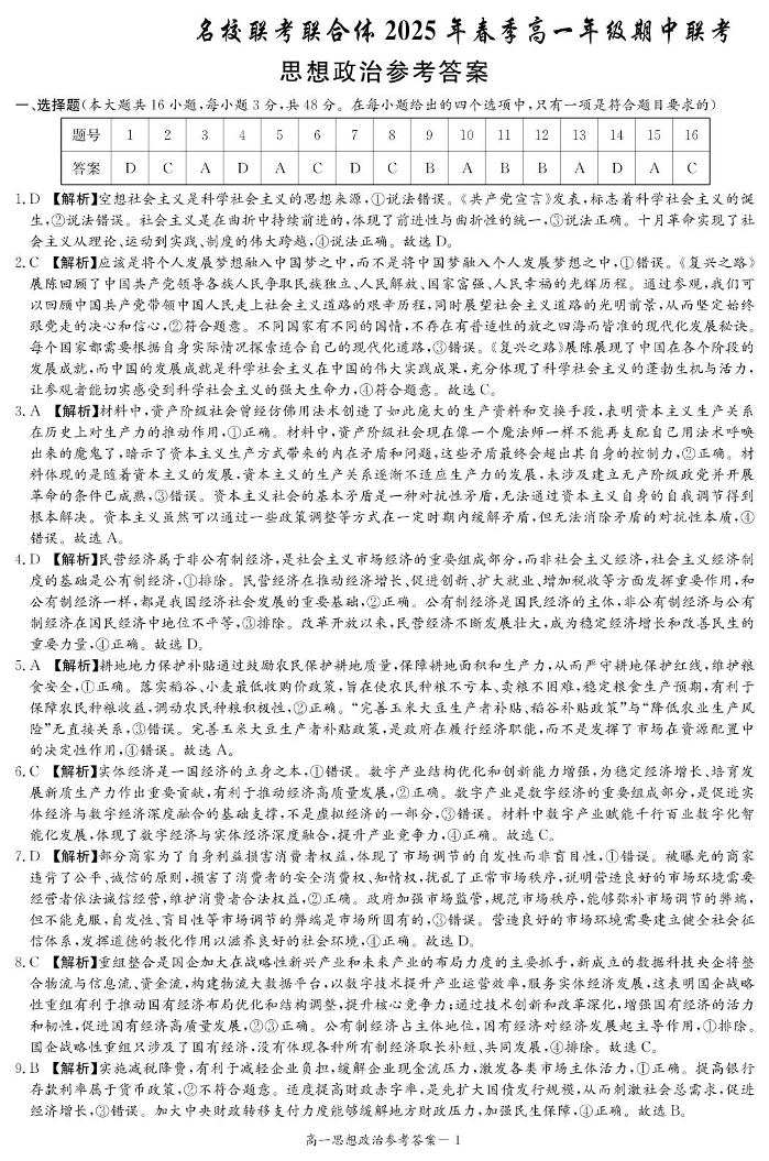 湖南省名校联考联合体2024-2025学年下学期高一期中考试政治答案