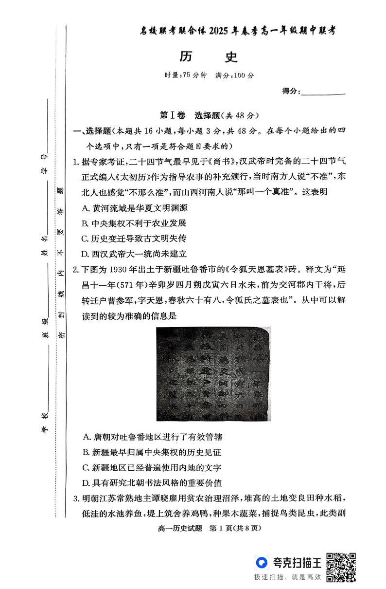 湖南省名校联考联合体2024-2025学年下学期高一期中考试历史