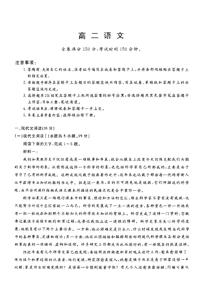 河南省部分学校2024-2025学年下学期4月高二质量检测语文+答案