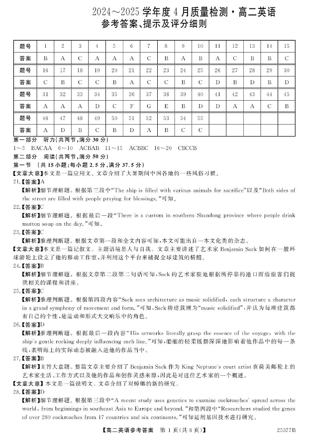 河南省部分学校2024-2025学年下学期4月高二质量检测英语答案