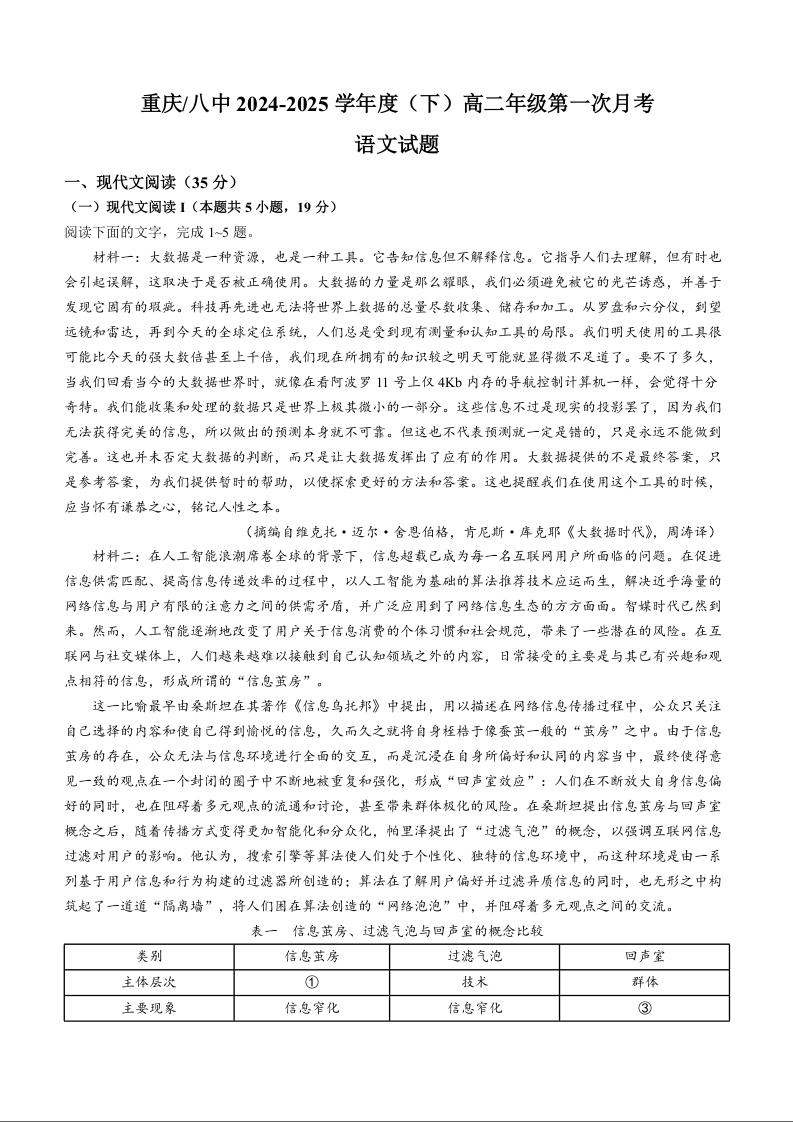 百强校丨重庆市第八中学2024-2025学年下学期高二第一次月考语文+答案