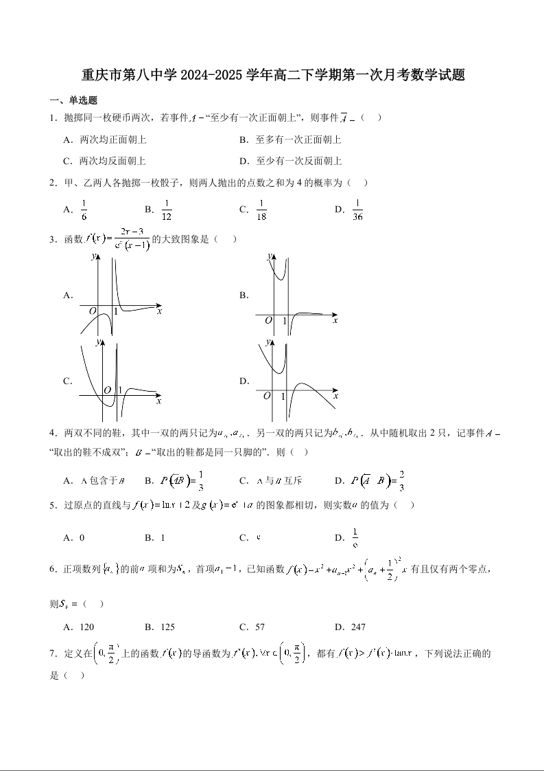 百强校丨重庆市第八中学2024-2025学年下学期高二第一次月考数学 +答案