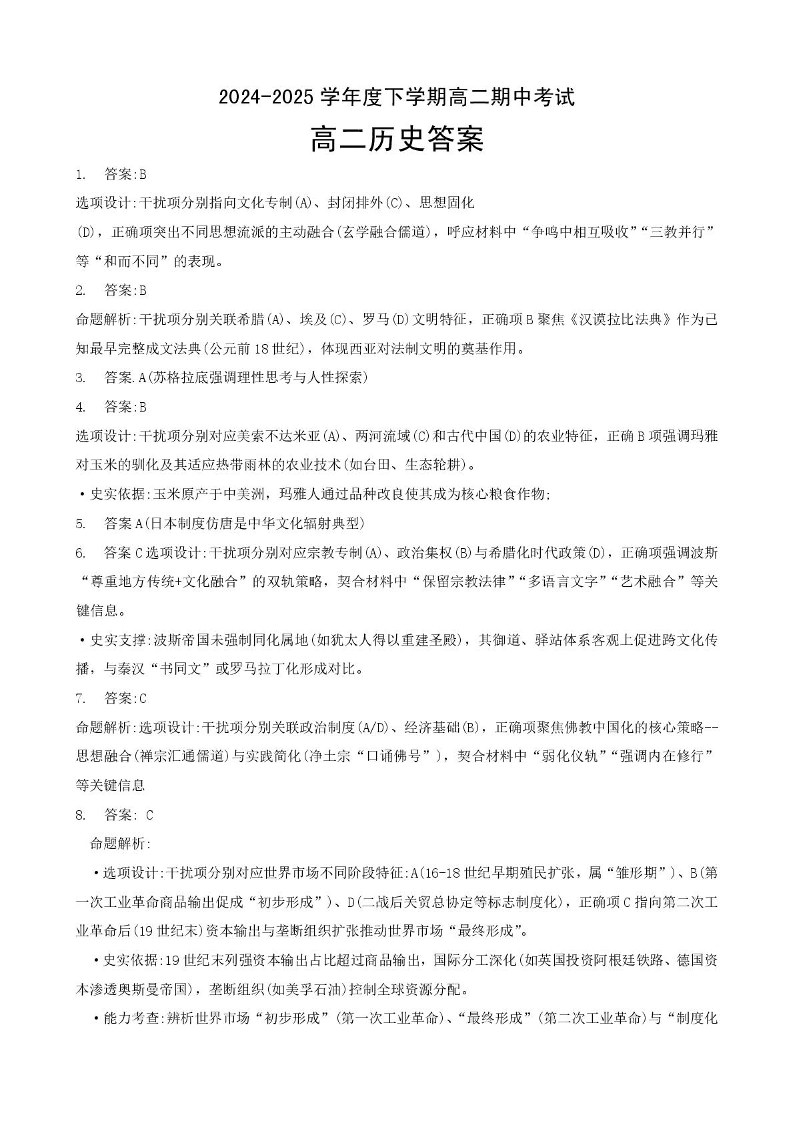 湖北省楚天协作体2024-2025学年下学期4月高二期中联考历史答案