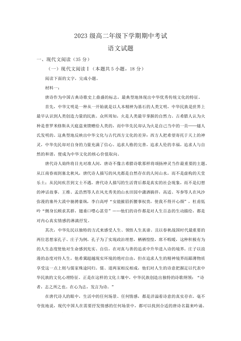 河北省邢台市名校协作体2024-2025学年下学期4月高二期中考试语文+答案