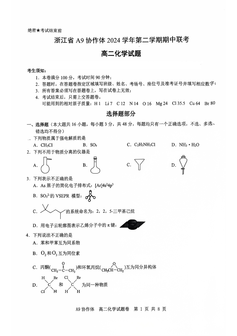 浙江省A9协作体2024-2025学年下学期4月高二期中联考化学+答案
