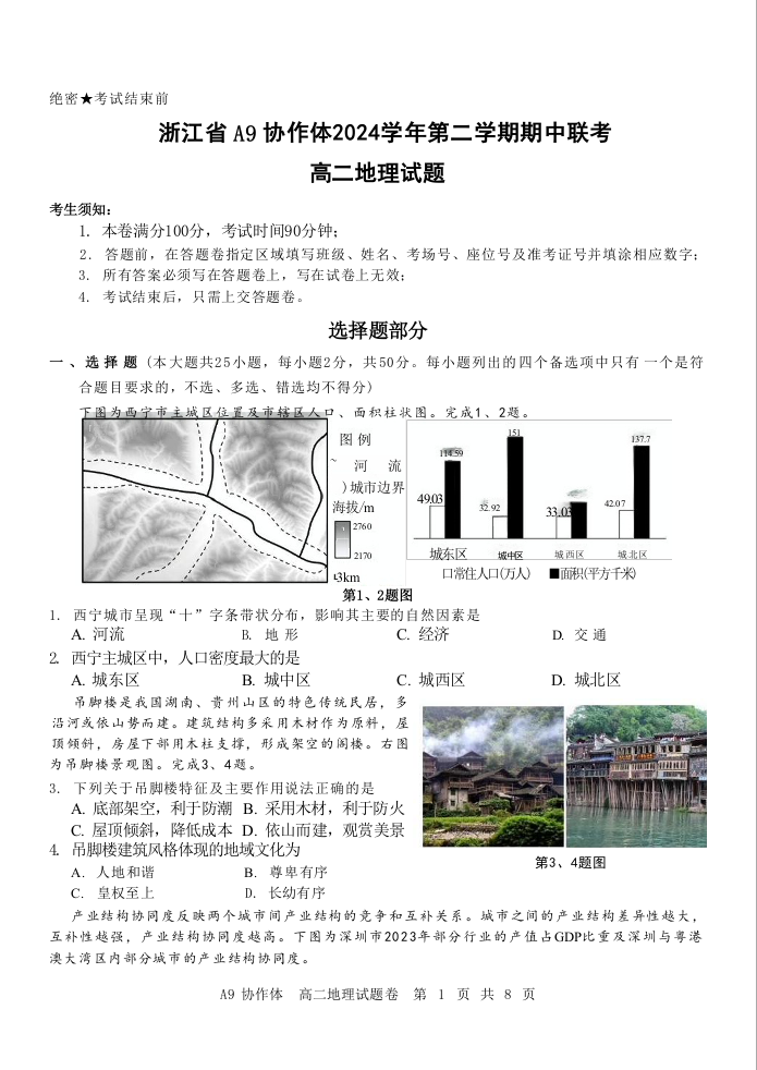 浙江省A9协作体2024-2025学年下学期4月高二期中联考地理+答案