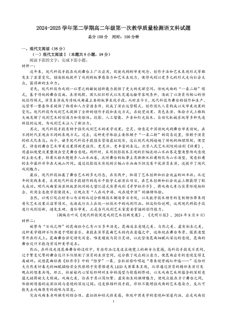 广东省三市三校2024-2025学年下学期高二第一次教学质量检测语文+答案