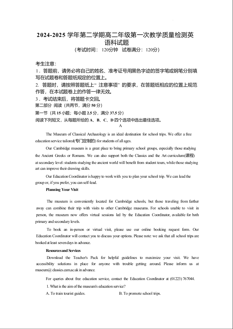 广东省三市三校2024-2025学年下学期高二第一次教学质量检测英语+答案