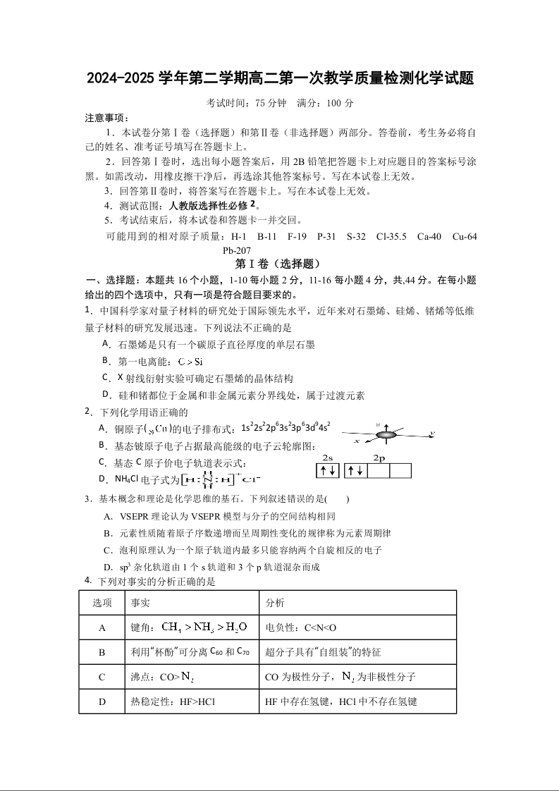 广东省三市三校2024-2025学年下学期高二第一次教学质量检测化学