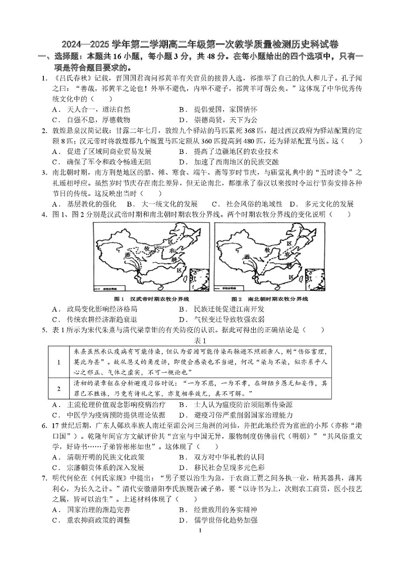 广东省三市三校2024-2025学年下学期高二第一次教学质量检测历史+答案