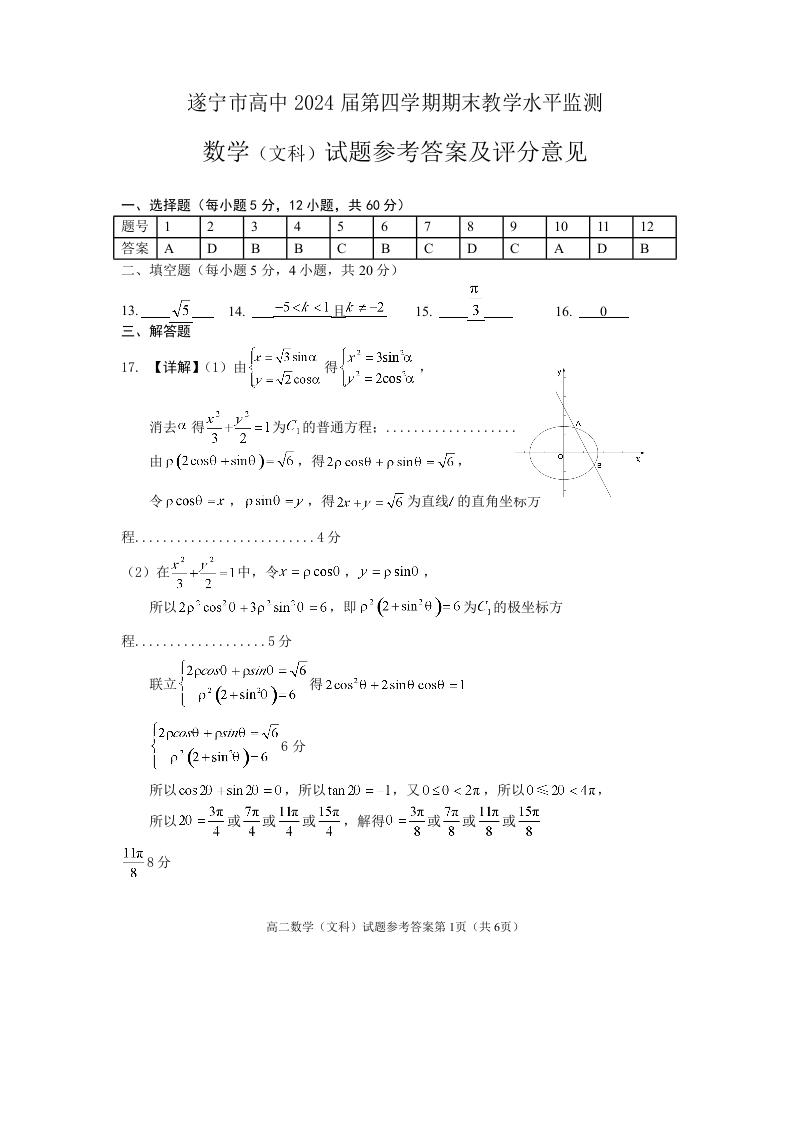 四川省遂宁市2024届下学期期末监测文科数学答案