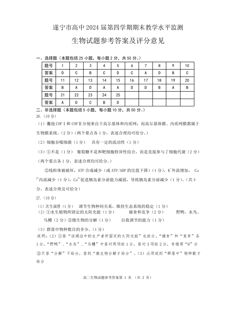 四川省遂宁市2024届下学期期末监测生物答案