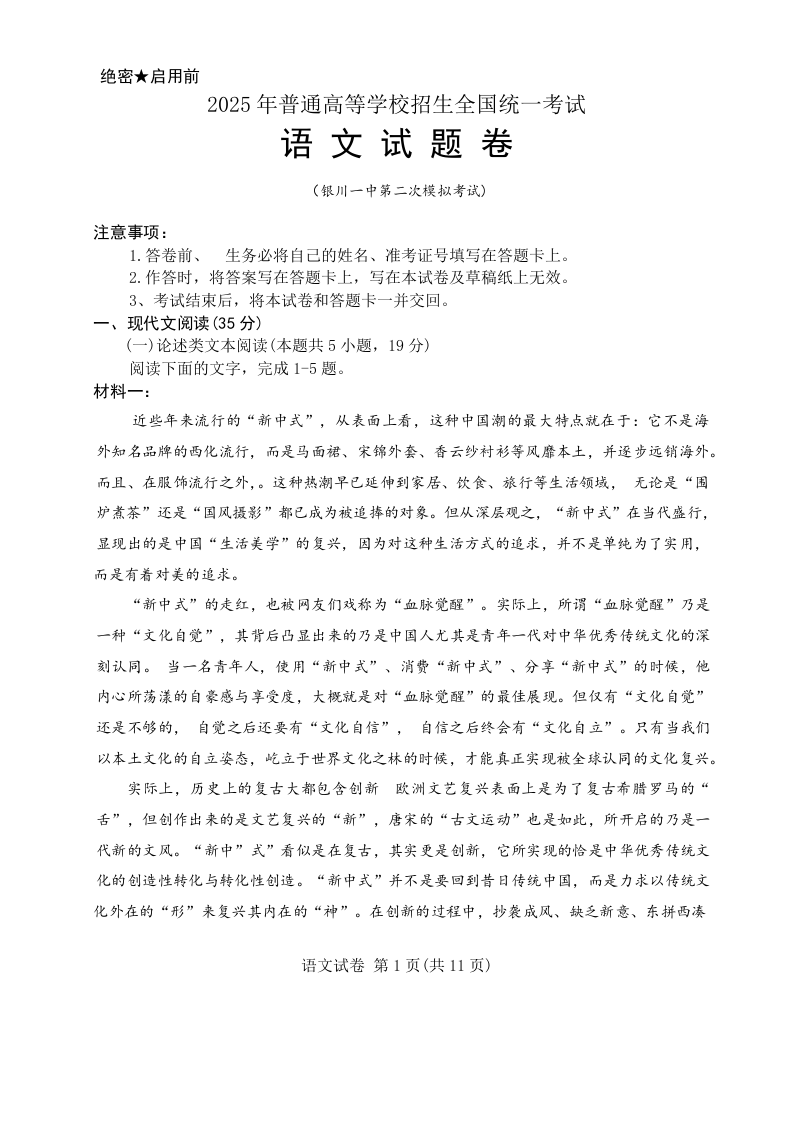 宁夏银川一中2024-2025学年下学期高三第二次模拟语文+答案