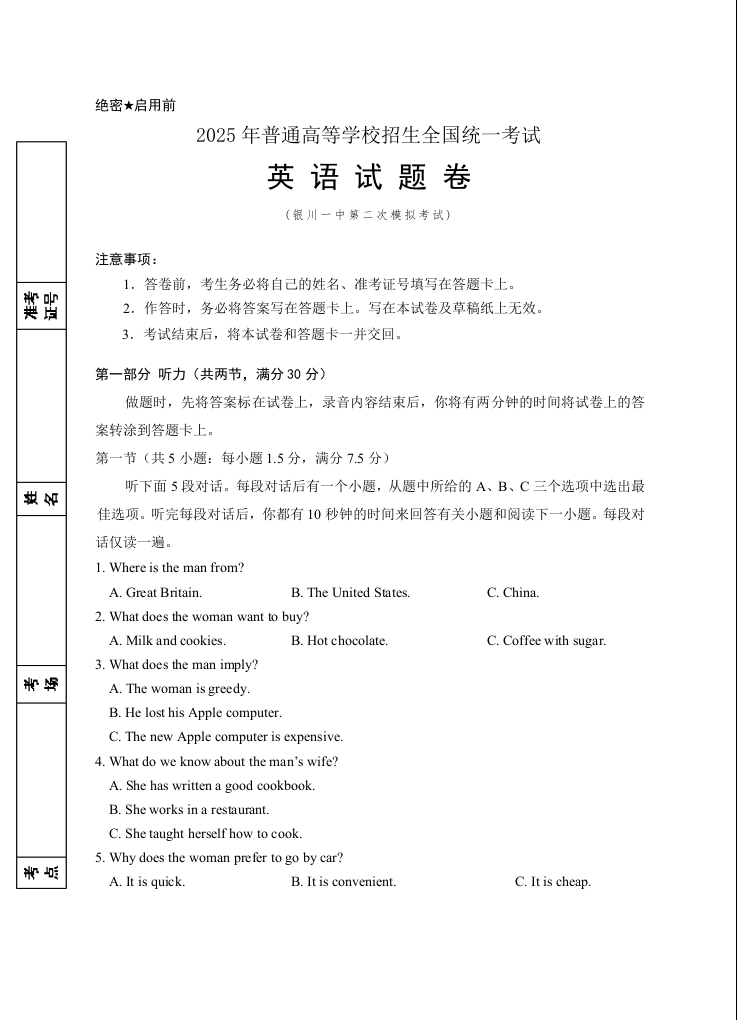宁夏银川一中2024-2025学年下学期高三第二次模拟英语