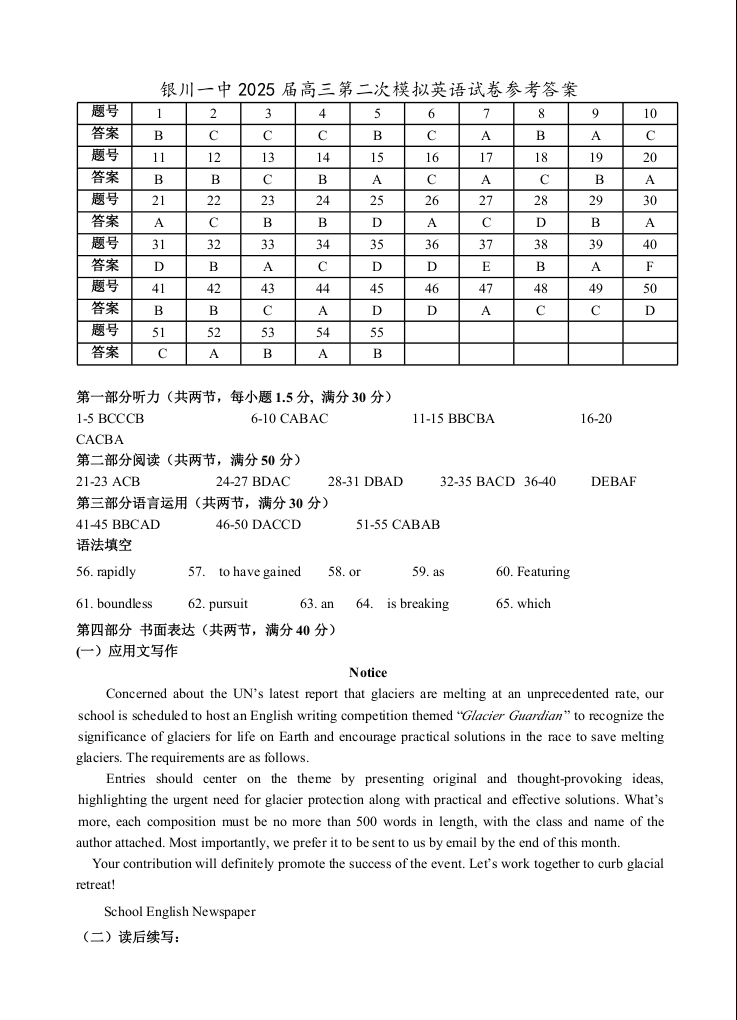 宁夏银川一中2024-2025学年下学期高三第二次模拟英语答案