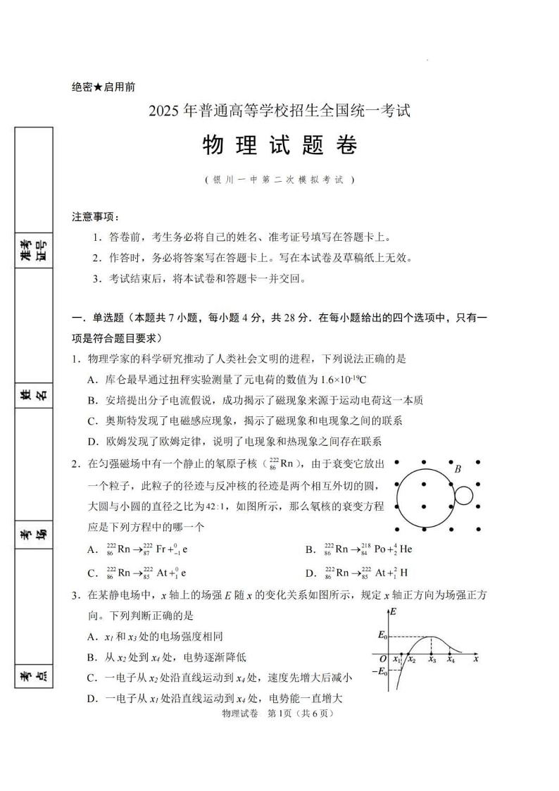 宁夏银川一中2024-2025学年下学期高三第二次模拟物理+答案