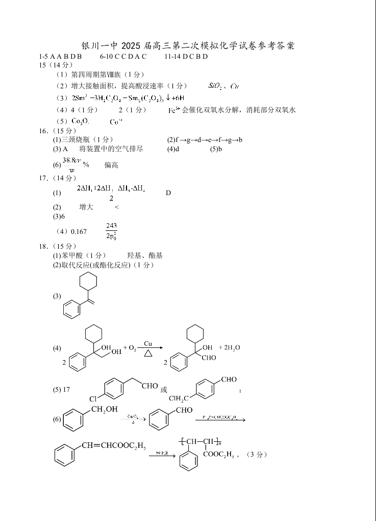 宁夏银川一中2024-2025学年下学期高三第二次模拟化学答案