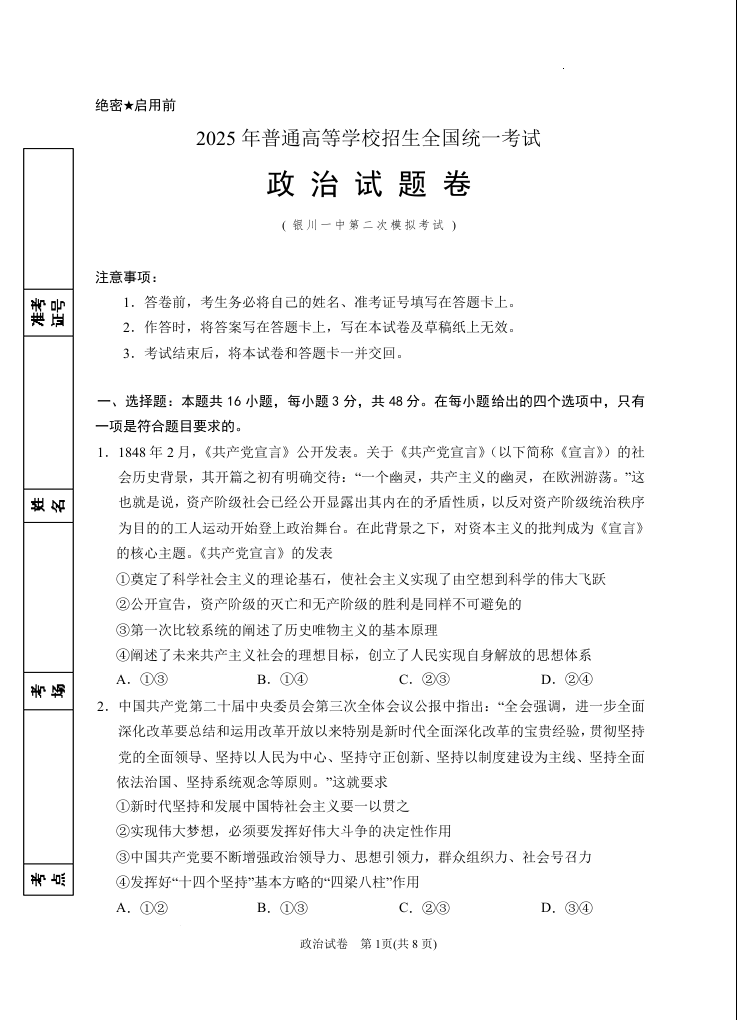 宁夏银川一中2024-2025学年下学期高三第二次模拟政治
