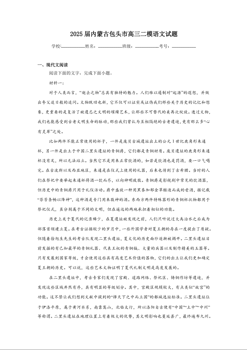 内蒙古包头市2024-2025下学期4月高三二模语文+答案
