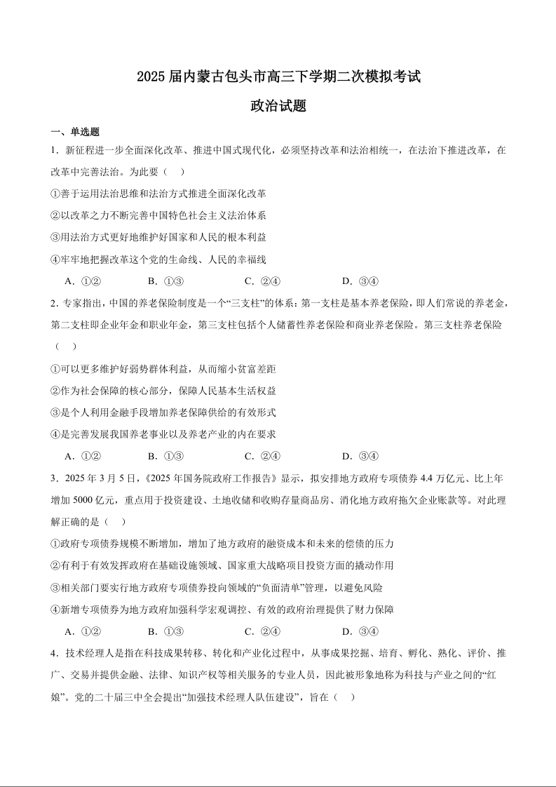 内蒙古包头市2024-2025下学期4月高三二模政治+答案