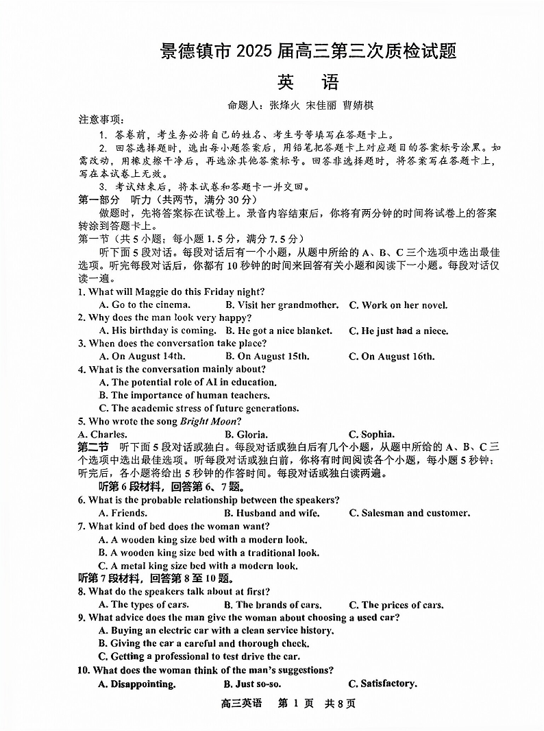 江西省景德镇市2024- 2025 学年高三第三次模拟质量检测英语+答案