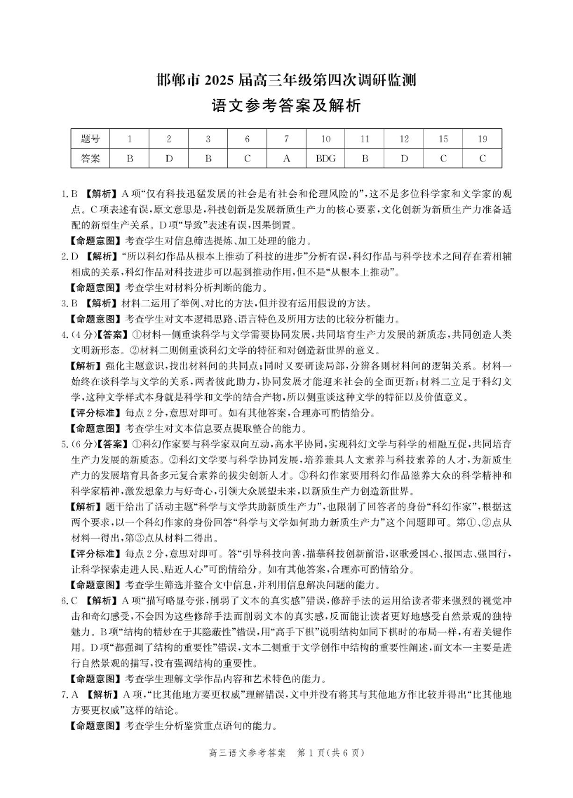 河北省邯郸市2024-2025学年下学期高三第四次调研监测语文答案