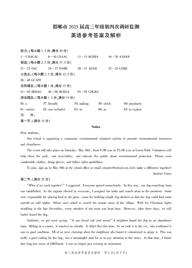 河北省邯郸市2024-2025学年下学期高三第四次调研监测英语答案