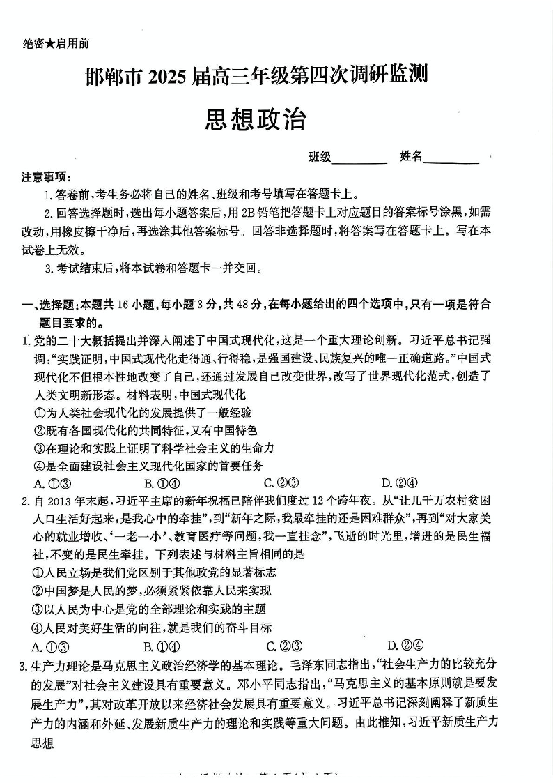河北省邯郸市2024-2025学年下学期高三第四次调研监测政治