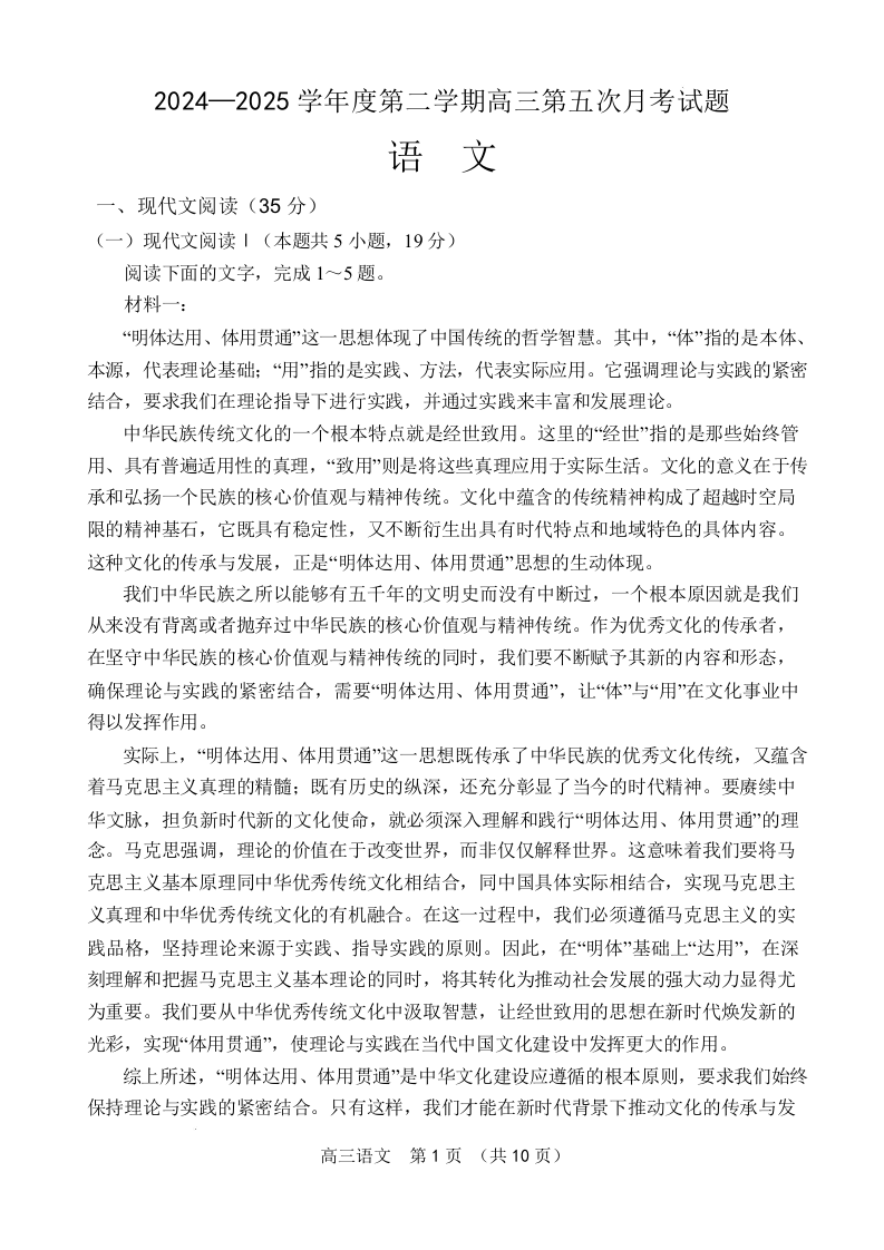 海南省文昌中学2024-2025学年下学期4月高三第五次月考语文