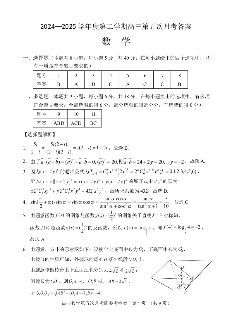 海南省文昌中学2024-2025学年下学期4月高三第五次月考数学答案