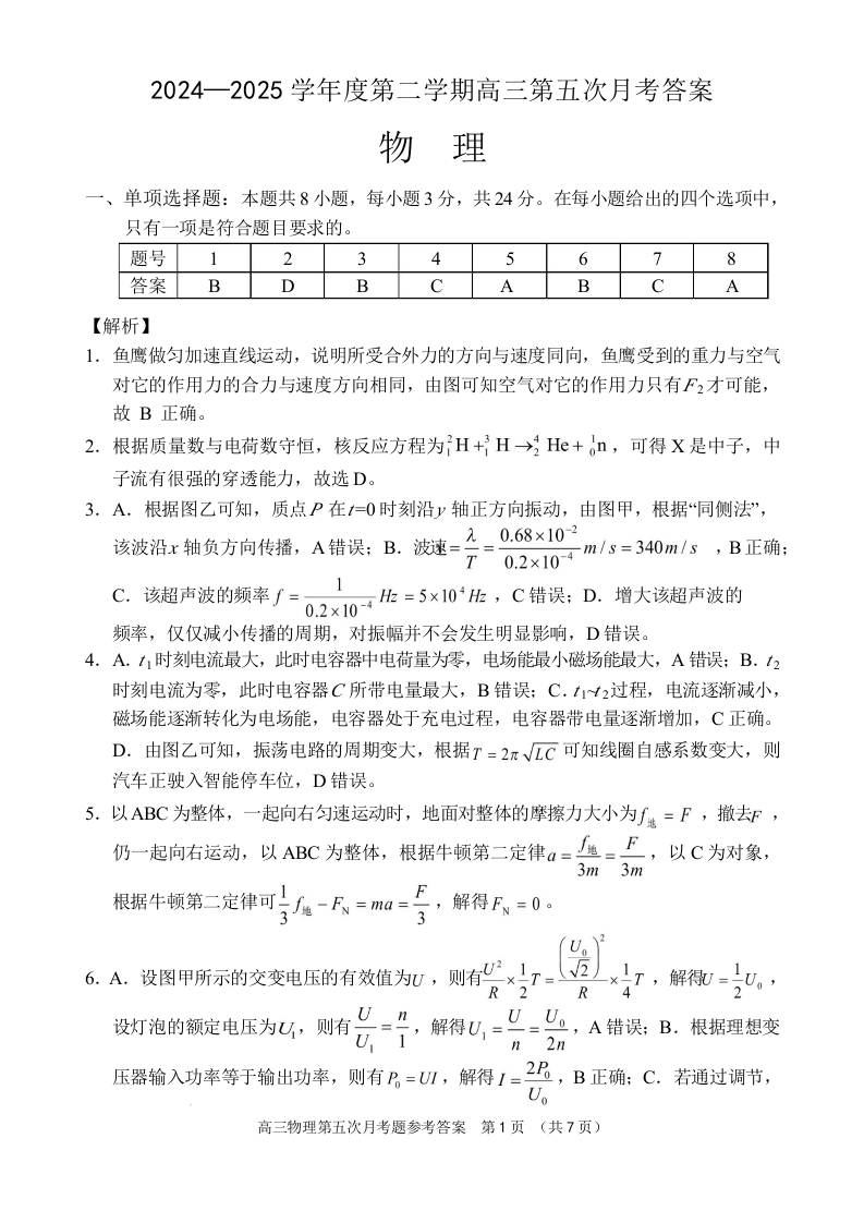 海南省文昌中学2024-2025学年下学期4月高三第五次月考物理答案