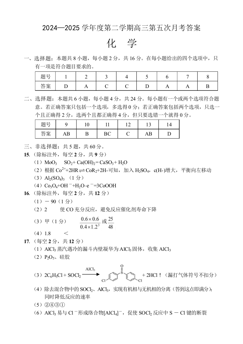 海南省文昌中学2024-2025学年下学期4月高三第五次月考化学答案