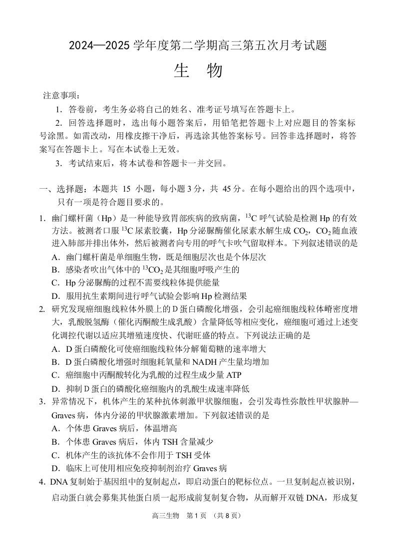 海南省文昌中学2024-2025学年下学期4月高三第五次月考生物