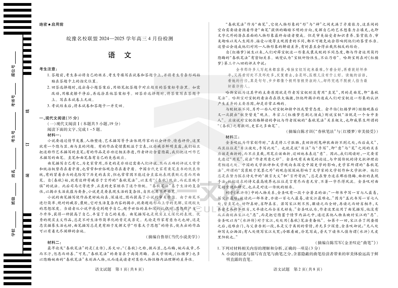 安徽省皖豫名校联盟2024-2025学年下学期4月高三检测语文
